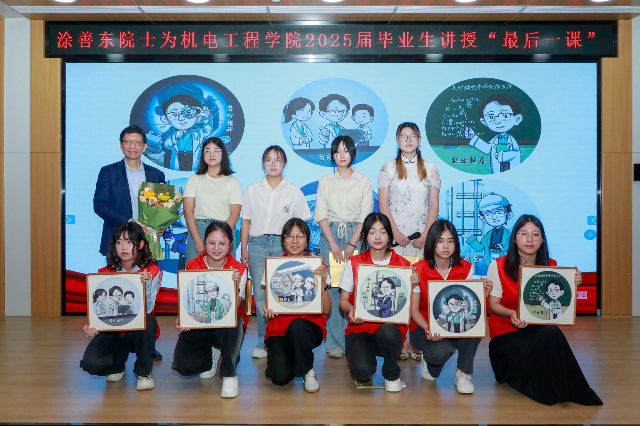 为表达对涂院士的崇敬与感恩之情,我校艺术设计学院师生代表以其教书育人、潜心科研及解决重大工程难题的经典形象绘制了卡通画作,在“最后一课”结束后,学生代表将六幅画作献给涂善东院士。涂院士回赠由其亲笔签名的文创产品,并激励同学们坚守初心、勇于创新,为国家科技发展贡献力量。
