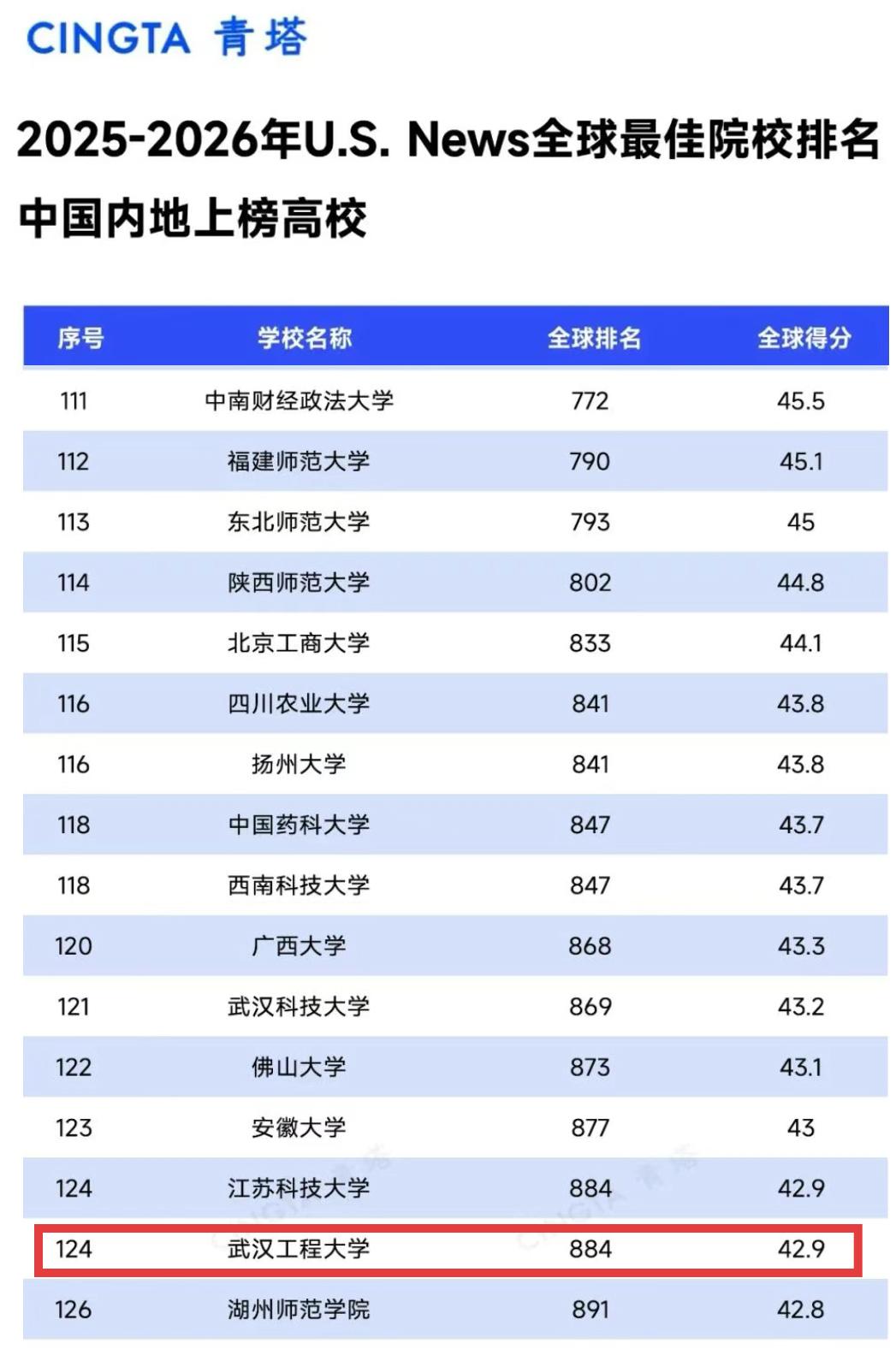 本网讯(通讯员 李昊昱 何巧玲)6月17日,U.S. News官网发布了2025-2026年度全球最佳院校排名。此次最新的排名中,我校荣列全球高校第884位,中国内地高校第124位,湖北省属高校第2位,全球排名再创新高。