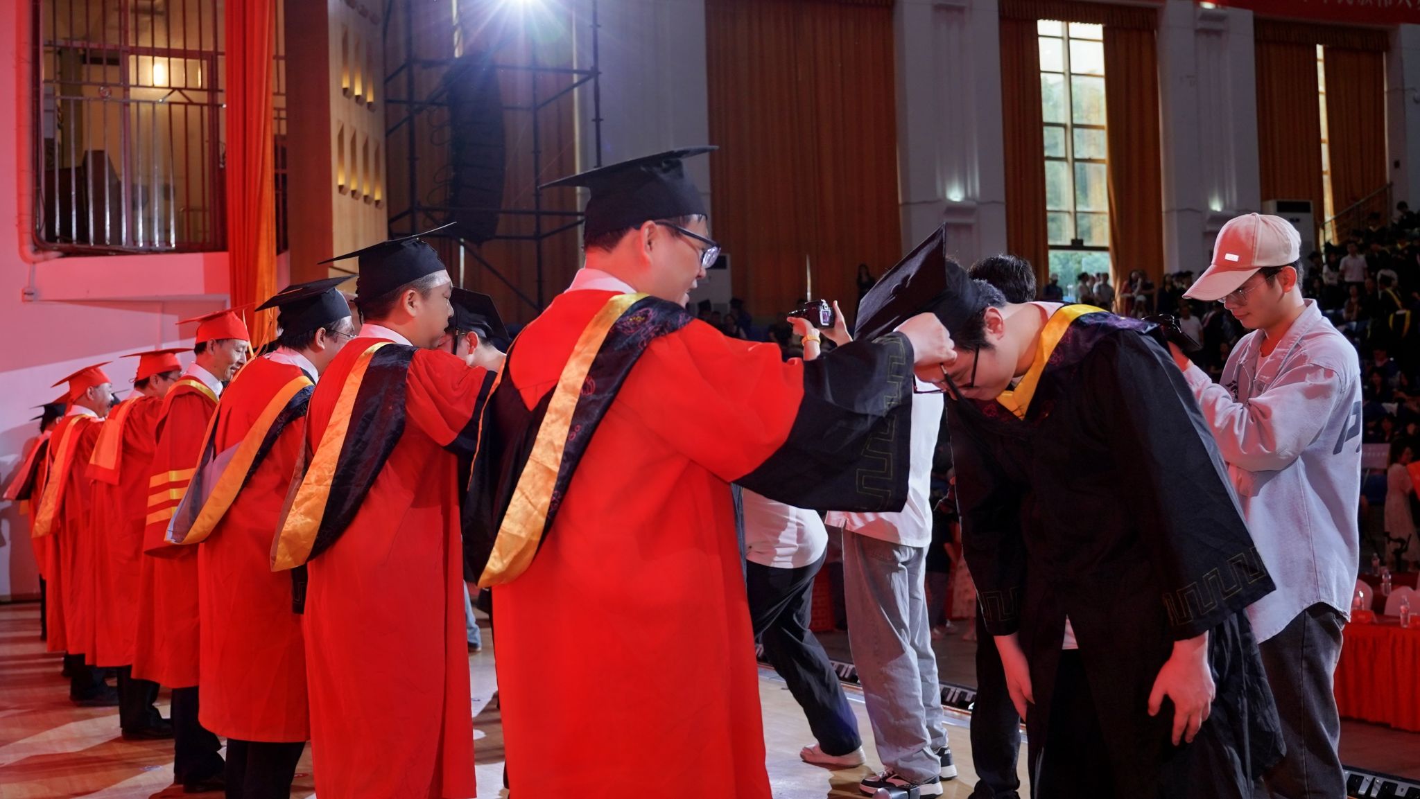 毕业典礼结束后,学位授予仪式庄重开启。校党委副书记、校长张彦铎宣读2025届毕业生学位授予文件,授位导师为全体毕业生逐一拨穂并合影留念。
