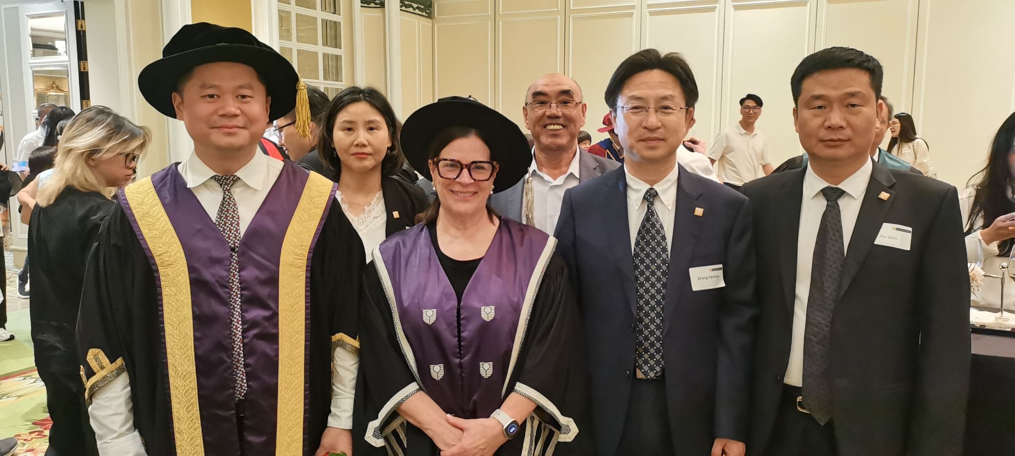 本网讯(通讯员 凌晨)6月24日,应澳大利亚科廷大学(Curtin University)邀请,校长张彦铎、副校长朱青林、国际交流合作中心主任杜春丽、化工与制药学院党委书记杨海波等一行五人前往广州参加2025科廷大学合作峰会,与科廷大学校长Harlene Hayne、全球常务副校长Xiaotian Zhang、副校长Carlo Marra、国际处处长Nigel de Silva、全球合作伙伴顾问Grace Ang亲切交流。