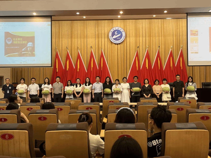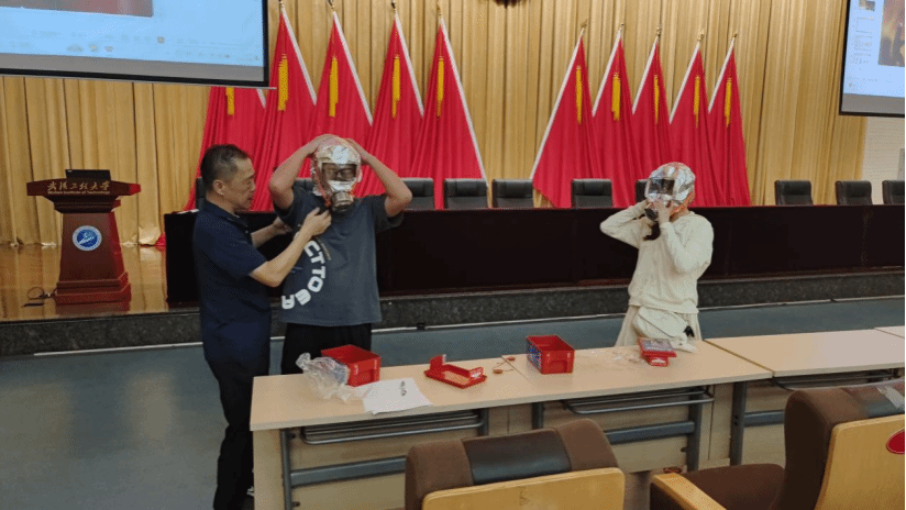 王子龙作暑期消防安全讲座。他通过展示丰富的案例,讲述了寝室、实验室火灾预防、扑救以及逃生的方法,强调了“三清三关三灭”的消防准则,指出违规给电动车充电,违规使用大功率电器引发火灾的危害。期间,他邀请学生上台,通过亲自示范教会学生正确使用防毒面具,有效提升了学生的自我防范意识。