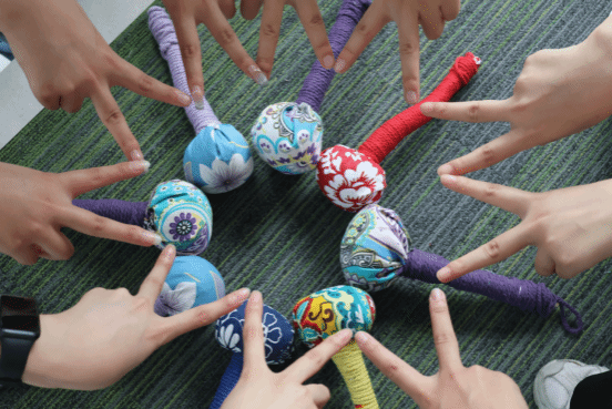 在课堂上,同学们学习了关于艾草的相关疗效的作用,也学会了经络理疗的养身知识。同学们跟着老师将艾草包进行包扎和固定,一个个五颜六色的经络锤便制作好了。