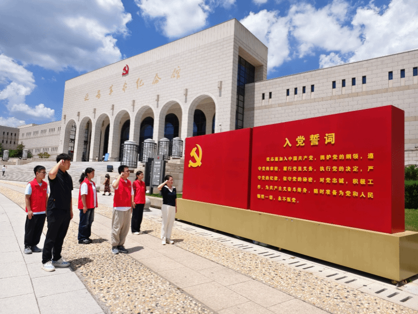 上午,实践团一行前往陕西省延安市延安革命纪念馆进行参观学习。坐落在凤凰山脚下的延安革命纪念馆绿树环绕,庄严肃穆。在纪念馆外,实践团在周丹带领下重温入党誓词。