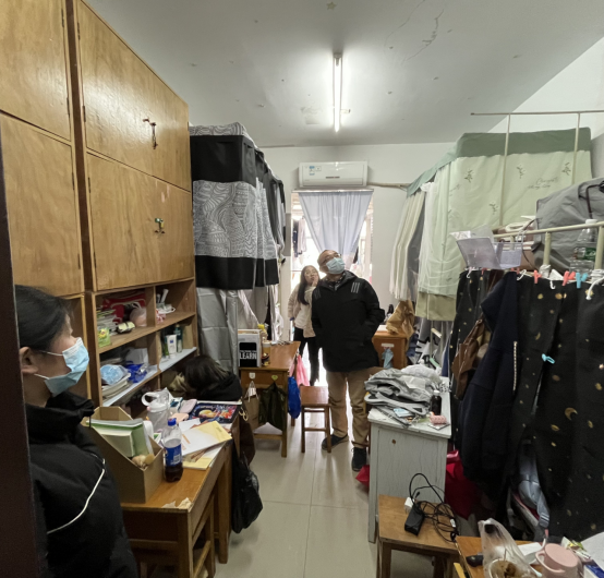 走访中,老师们走进宿舍与学生亲切交流,关切询问假期生活,详细了解学生的学习生活情况,为大家发放防疫物资,并重点强调安全、作息、纪律、文化建设等方面的注意事项。李义伟指出,目前全国疫情形势依然严峻,同学们在日常生活中要注意做好个人防护,加强宿舍内务的整理,营造一个健康、舒适、温馨的生活环境;同时希望同学们尽快调整状态,完成从假期到新学期的状态转变,更好更快地适应新学期生活,以积极饱满的精神状态投入新学期的奋斗中。在走进2022届毕业生宿舍交流时,李义伟鼓励同学们积极面对每次就业机会,把握机遇、直面挑战,为自己丰富多彩的大学生活画上一个完美的句号。