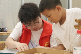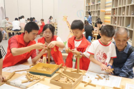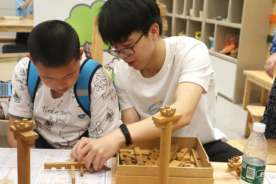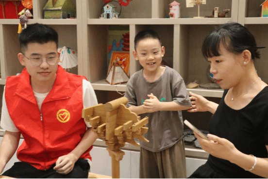 志愿者与一些小朋友也开始了“结对帮扶一对一”跟随,我们像好朋友一样牵着他,给予他们大哥哥大姐姐的温暖与陪伴。接下来是最重要的模拟拼搭应县木塔实践环节。一眼看过去眼花缭乱的木质构件、繁琐的拼搭过程更激发了小朋友们争抢好胜的决心与勇气。在家长与志愿者的协同帮助下,各种问题被一点又一点地克服解决,耐心与技巧在一次又一次尝试下逐步提高,当所有木制构件搭建成功的那一刻,满满的成就与骄傲感让孩子们绽放出最为纯粹的笑容!