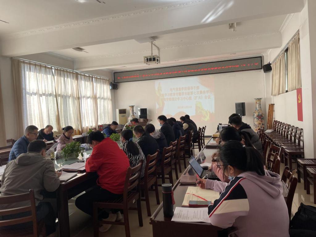 本网讯(通讯员 周雯琪)11月12日,电气信息学院在4B319会议室召开领导干部党史学习教育专题读书班第七次集体学习暨院党委理论学习中心组(扩大)会议,主要学习党的十九届六中全会精神,学习近平总书记在纪念辛亥革命110周年大会上的重要讲话精神,学习近平总书记在中央人才工作会议上的重要讲话精神以及《尊龙凯时人生就是博教师专业技术职务任职资格申报评审条件(试行)》、《尊龙凯时人生就是博专业技术职务任职资格申报评审实施办法(试行)》、《尊龙凯时人生就是博重点人才专业技术职务任职资格评审绿色通道实施办法(试行)》等职称评审文件,会议由学院党委书记谢春晖主持,学院党委委员、党支部书记、各系部主任及民主党派代表参会学习。