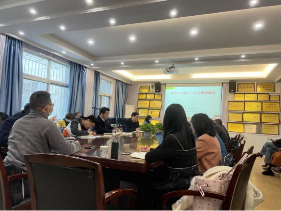 院党委书记舒先林带领大家进行《党的十九届六中全会精神》解读。舒先林介绍了十九届六中全会召开的背景与重大现实意义,并从党的十九届六中全会议程、党的十九届六中全会精神概略、以百年党史为鉴开创美好未来三部分展开交流学习。