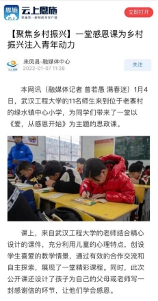 自乡村振兴战略实施以来,管理学院积极投入到学校助力恩施州老寨村的乡村振兴工作当中,以实际行动做好巩固脱贫攻坚成果和乡村振兴有效衔接工作。学院团委以此次寒假社会实践工作为契机,组建“星火”乡村振兴实践团,面向恩施州老寨村开展了以青创行动、青漾行动、青享行动、青心行动、青情行动等五大行动为主要内容的“星火·老寨”乡村振兴专项行动,助力老寨村在产业振兴、人才振兴、生态振兴、文化振兴和组织振兴上取得新突破。组建以专任教师、我校驻村干部为主要人员构成的“星火”青年讲师团,带领“星火”乡村振兴实践团的成员深入绿水镇中心小学,为当地的一百五十多名六年级学生上了一堂充满爱与感恩的红色公开课。在当地实践期间,学院团委共举办7期“星火”分享会,邀请当地党政机关领导、学者以及优秀青年代表作为主讲人,开展经验交流和实践感悟分享,并聘任部分主讲人作为校外社会实践指导教师,强化实践指导关系。考虑到老寨村现今的产业情况,学院团委鼓励学生在参加“三创”赛、挑战杯等全国性赛事时,将老寨村乡村振兴作为研究重点,组建了二十余支重点团队开展相关主题的研究,并邀请该领域资深教授作为指导教师,助力当地发展特色产业,引导学生在实践中学以致用,用以促学,学用相长,知行合一。此外,参与此次“星火·老寨”专项行动的“星火”乡村振兴实践团成员们结合当地的乡土风情、人文风貌,拍摄的《星火中的老寨》纪录片一经播出,便“刷爆”朋友圈,更是创造学院公众号成立以来的最高浏览量,视频点击量更是突破了10000次以上,展现了新青年视野下乡村振兴战略中的美丽乡村新景象。