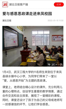 管理学院2022年“返家乡”寒假社会实践以“新时代新征程,新青年兴家乡”为主线,以学生返回家乡为契机,着力打造三大特色品牌实践团——“星火”乡村振兴实践团、“峥嵘红色岁月”党史学习教育实践团和“红石榴”民族团结社会实践团,围绕着党史学习教育、乡村振兴、民族团结等主题重点开展社会实践工作。三大实践团成立以来,受到了学院师生的热切关注,总体上发展都处于较好的势头。截止目前,“星火”乡村振兴实践团共有成员98人,“峥嵘红色岁月”党史学习教育实践团共有成员86人,“红石榴”民族团结实践团共有成员17人。其中“星火”乡村振兴实践团在今年寒假社会实践中成果突出,收获颇丰,成员们在七个省份、三十多个市州中留下了管院青年的足迹。特别是前往恩施州来凤县开展的志愿服务、爱心支教等活动受到了当地较为热烈的反响,得到了《湖北日报》、《云上恩施》以及来凤县政府官网的重点报道。