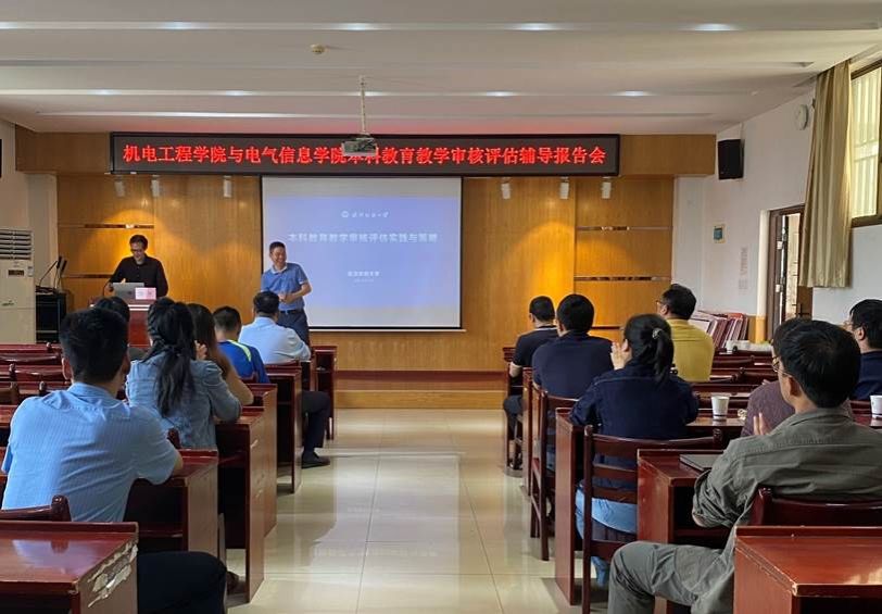 本网讯(通讯员 马琳伟)5月8日,机电工程学院联合电气信息学院召开本科教育教学审核评估辅导报告会,特邀武汉纺织大学教学评估中心周平主任对学院审核评估准备工作进行指导并作专题报告。机电工程学院党委书记郑玲莉和院长郑小涛热情欢迎周平主任的亲临指导,报告会由郑小涛主持,电气信息学院副院长田斌、机电工程学院院长助理马琳伟及系主任、教研室主任、骨干教师等参加会议。