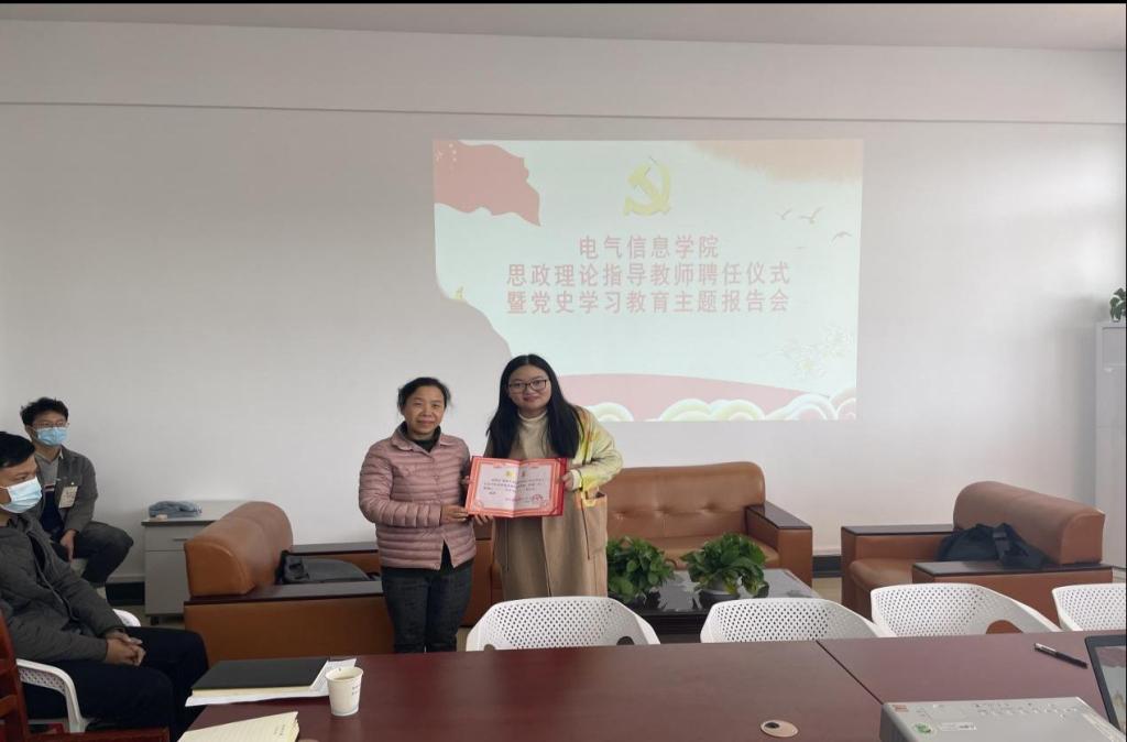 本网讯(通讯员 周雯琪)11月9日,电气信息学院在4B实验楼326会议室举办思政导师聘任仪式暨党史学习教育主题报告会。会议邀请马克思主义学院蔡梦雪老师做专题报告,学院相关负责人出席仪式。