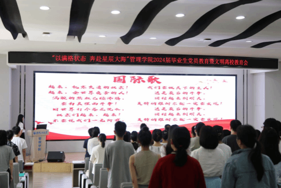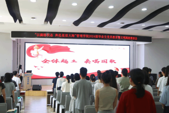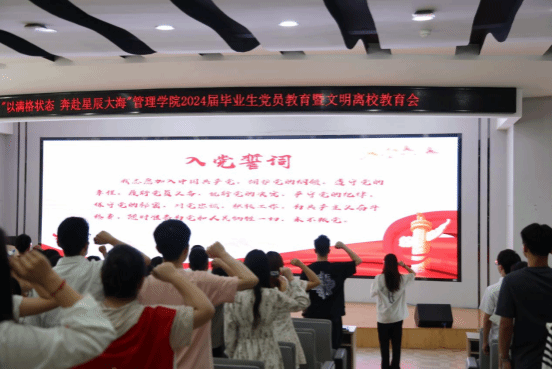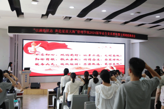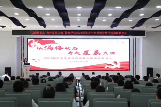 本网讯(通讯员 李梓煜)6月12日,管理学院党委举行“七个一”毕业生党员教育暨文明离校教育会,学院领导班子成员、党支部书记以及全体毕业生党员出席会议,大会由辅导员李梓煜主持。