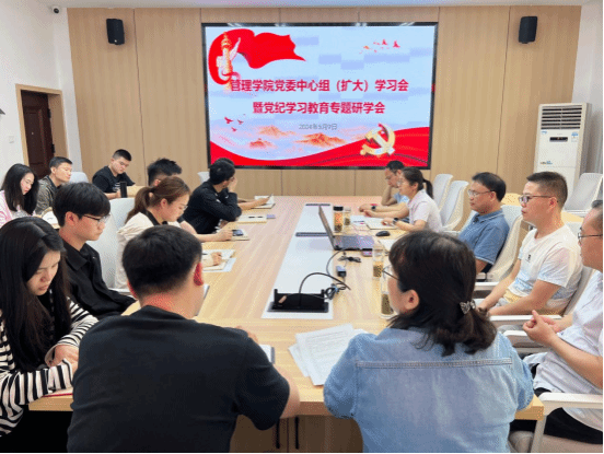 本网讯(通讯员 李梓煜)5月9日上午,管理学院党委在文科楼425会议室召开党委中心组(扩大)学习会暨党纪学习教育专题研学会。学院党委理论学习中心组成员、各党支部书记参加,会议由学院党委书记左辉主持。