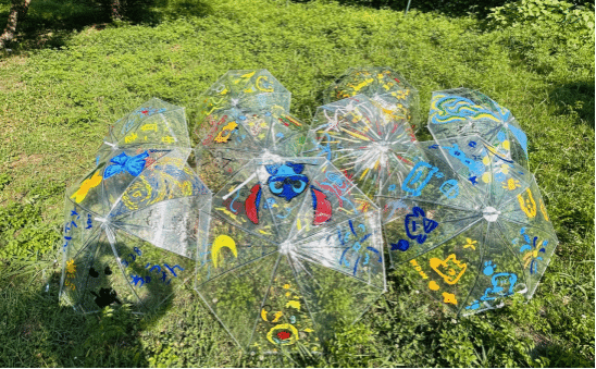 同学们撑开雨伞、拿起画笔,搭配自己喜爱的颜色,用简单的线条和涂鸦将自己的奇思妙想描绘在透明的伞面上。同学们发挥自己的想象力:彩虹线条,色彩鲜艳;点点雏菊,小巧淡雅;小松鼠、海豚和蝴蝶等小动物活泼可爱、活灵活现……在作品中,同学们仿佛看到了自己内心的色彩,感受到了那份独特的宁静与享受。