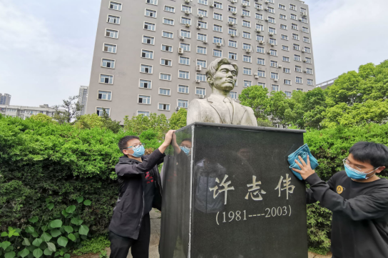 在许志伟雕像前,同学们集体向许志伟同志默哀,寄托哀思。默哀结束后,阅读推广部毛竞永老师向大家介绍了许志伟的生平经历,随后学生代表彭朝凯发言,倡议同学们从我做起,从身边点滴做起,向许志伟学习。师生们向烈士许志伟的塑像敬献了鲜花,表达对英雄的怀念和崇敬。活动结束后,全体同学对广场进行清扫。