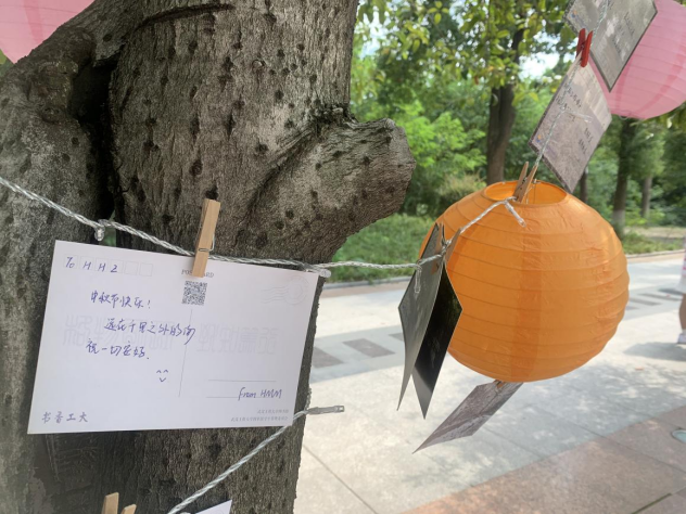与此同时,线下“灯影映轮月,满愿衔枝头”活动正有条不絮的进行。线下活动分三个部分:图书馆大厅赏文创纸雕灯、图书馆门口摆点处领取明信片寄语、心愿树下挂寄语祝福。图书馆大厅内充满节日氛围的纸雕灯悬挂于空中,引得不少同学驻足观赏。馆外路过的同学纷纷前来领取明信片,并写上对自己、家人与祖国的美好祝福,并将其挂在心愿树上。皎洁的月光洒落在枝头上,伴随着树枝上盘绕的一串串闪光的氛围灯,还有悬挂于枝丫间的明信片与树下祝福的同学们,此情此景显得格外浪漫朦胧。