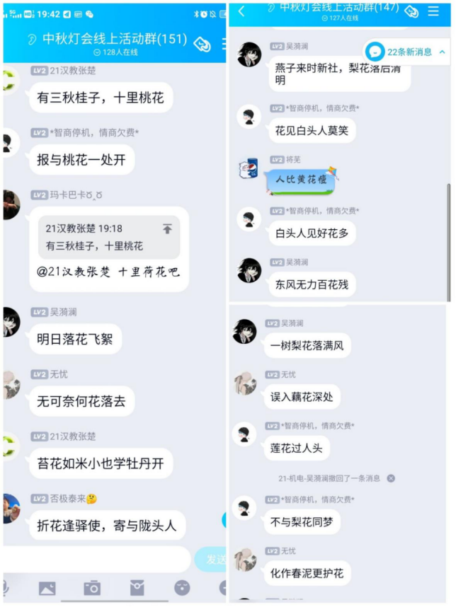 当晚19:00线上、线下活动同时开展。同学们通过加入中秋灯会线上活动群,参与飞花令及猜灯谜活动。虽是线上活动,但大家参与活动的热情不减。活动负责人在群里发布相关提示词,同学们马上开动脑筋,争相抢答。单是一个“花”字,就引出同学们的无限遐想,不论是“花谢花飞花满天”,还是“桃花庵里桃花仙”,亦或“月照花林皆似霰”,一字一句不仅展示出中华优秀诗词文化的博大精深,也突显出同学们对中国诗词文化的喜爱。与此近似的“猜灯谜”活动,同学们通过扫描负责人在群中发布的二维码参与线上答题,其中涉及到成语、诗词、书籍、电影等方面,一方面考验了同学们的知识水平,另一方面也加深了大家对中国文化的认知。