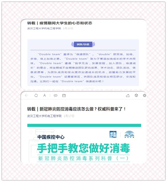 1月初,河北疫情来势汹汹,学院党委高度重视,第一时间做出应对,精准摸排到中高风险区学生近30人,迅速建立起“一对一”责任到人、不留死角的疫情防控工作责任落实体系。学院分管领导、辅导员、班主任每天通过电话、微信、视频等与学生进行不断线联系,指导居家学生积极配合当地完成核酸检测工作,及时了解学生思想和生活状况,同时与家长保持密切沟通。学院通过微信公众号每日推送文章,普及疫情防控和心理健康知识,帮助学生保持良好状态,切实筑牢战“疫”心理防线。
