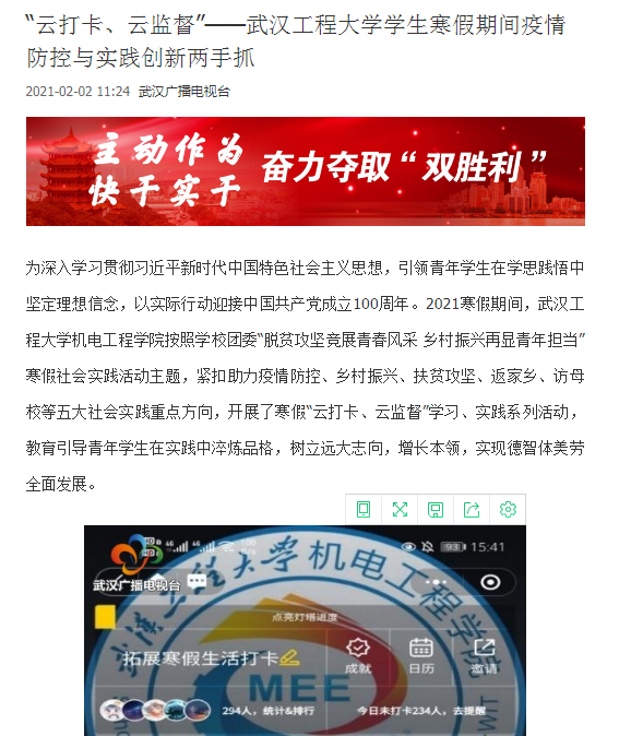 2021寒假期间,机电工程学院紧扣助力疫情防控、乡村振兴、扶贫攻坚、返家乡、访母校等五大社会实践重点方向,开展了寒假“云打卡、云监督”学习、实践系列活动。特别鼓励学生在做好自己防护的基础上,参加当地疫情防控志愿活动,在抗击疫情中进一步培养坚忍不拔的奋斗精神和赤诚仁爱的家国情怀。