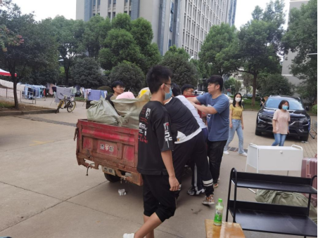宿舍搬迁过程中,学校提供编织袋、推车、摆渡车,帮助学生提高搬迁效率,学院18级、19级、20级的男生们也纷纷前往教辅六协助我院女生搬宿舍。学院党委副书记王超、辅导员朱华杰在搬迁现场指挥,协助学生顺利完成宿舍搬迁工作。