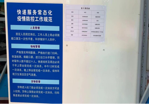 为落实落细“人物地”共防措施,严防“物传”输入,针对快递点人流、物流相对密集的问题,公司对快递点提出四点要求:一是严格规范物品、场地及人员管理,制订个性化《快递点常态化疫情防控工作规范》,确保制度上墙,责任到人;二是严把快递件消杀关,确保所有快件每日进校时、上架前、领取时及开关门前后、门店周边环境的消杀程序,每天做到6次消杀,并加强督查力度;三是增加快递点工作人员核酸检测的频率,切断源头风险;四是组织土木学院大学生志愿者现场维护秩序,规避员工聚集风险,确保快递点日常经营有序开展。