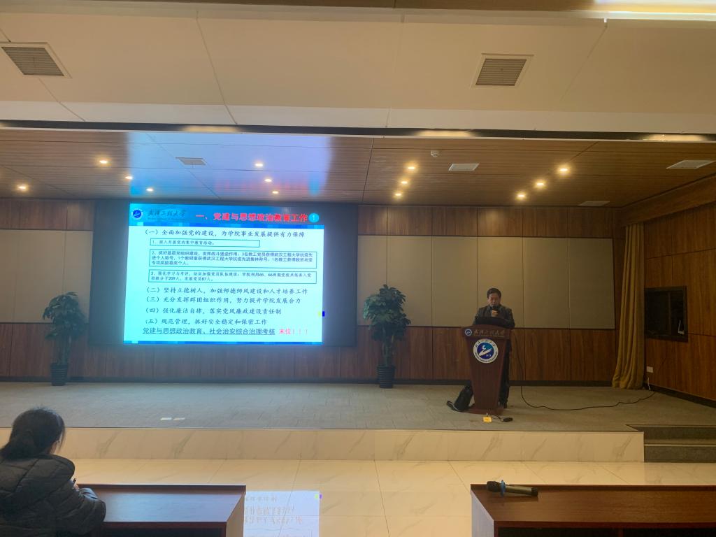 首先,吴云韬作了《计算机科学与工程学院、人工智能学院2020年工作总结和2021年工作计划》报告,从党建与思想政治教育、本科教学、学科建设、科学研究和师资队伍建设五个方面全面总结了学院2020年取得的成绩。在全院老师共同的努力下,学院在2020年目标管理责任制考核中获得综合考核优秀,1个单项优秀的成绩,取得近三年来最好成绩。随后,吴院长对学院2021年工作进行部署。他从本科教学、学科建设、科研、人才引进、十四五规划、文化建设、改善教师工作条件等方面详细阐述和安排学院即将开展的重点工作。他强调,目前学院在持续健康向好发展,希望全体教职员工在新的学年振奋精神,以真诚的心态,以饱满的热情、以务实的作风投入到学院的各项工作中去,为改变学院、发展学院、成就学生、成就自我而努力工作。