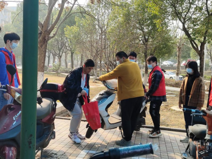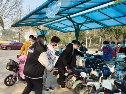 最后,志愿者们一同回到学院停车场,整理电动车摆放秩序,在停车棚挂上规范停车指示牌,号召大家自觉规范停放电动车。