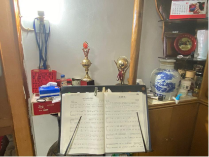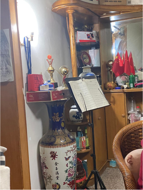 在老人的家中,闪耀的奖杯和乐谱见证了老人们文艺工作的荣耀时刻。成堆的书籍反映了老人们笃实好学、喜爱读书的晚年爱好。最后,志愿者们与老人们合影留念。