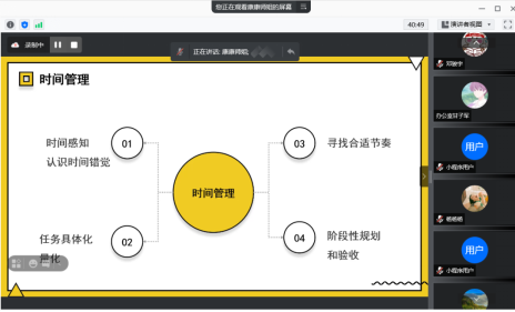 实践团通过打造系列线上沙龙课程,为大学生们提供时间管理、执行力提升、大学生常用公文写作等线上沙龙或研讨。在指导老师王乃婧和队长黄雨泽同学的带领下,团队成员制作和开展了两场大学生职场通用技能实用课程,并通过制作海报和发文推广,面向各个高校和各个层次的大学生进行广泛宣传,活动覆盖人群700人次,旨在帮助大学生有效掌握立足职场的通用技能。