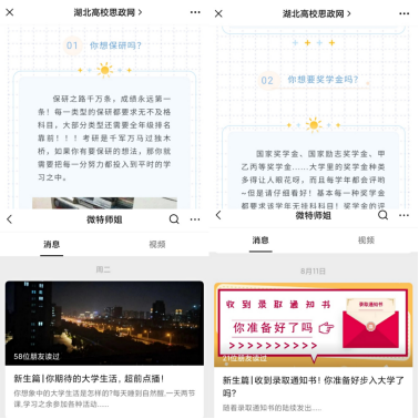 实践团积极探索网络环境下的生涯教育方式,关注和解决各种背景不同的大学生的多元化生涯规划问题。围绕新生最为关心的学习、生活、工作等问题,实践团通过精心设计和撰写,发布原创文章《收到录取通知书!你准备好步入大学了吗?》《不挂科的大学生活不完整?拒绝毒鸡汤》《你期待的大学生活,超前点播!》等十余篇学生喜爱的新生篇系列推文,为新生提供思想引领、学习技巧、校园活动、大学生生活等方面的指导,达到大学生涯启蒙的效果。