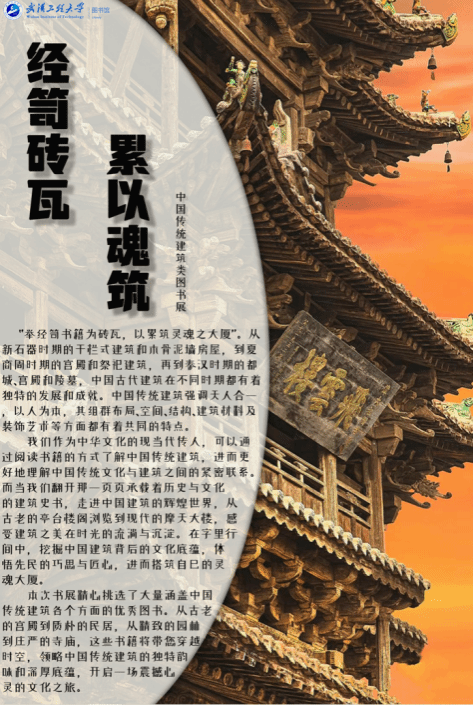 本网讯(通讯员 金吉晖 冉承阳)近日,为展示中华传统建筑的独特魅力和深厚内涵,促进读者对中华传统建筑艺术的了解与赏析,弘扬中华民族传统文化,图书馆在武昌馆一楼大厅举办“经笥砖瓦,累以筑魂”中国传统建筑类主题书展。