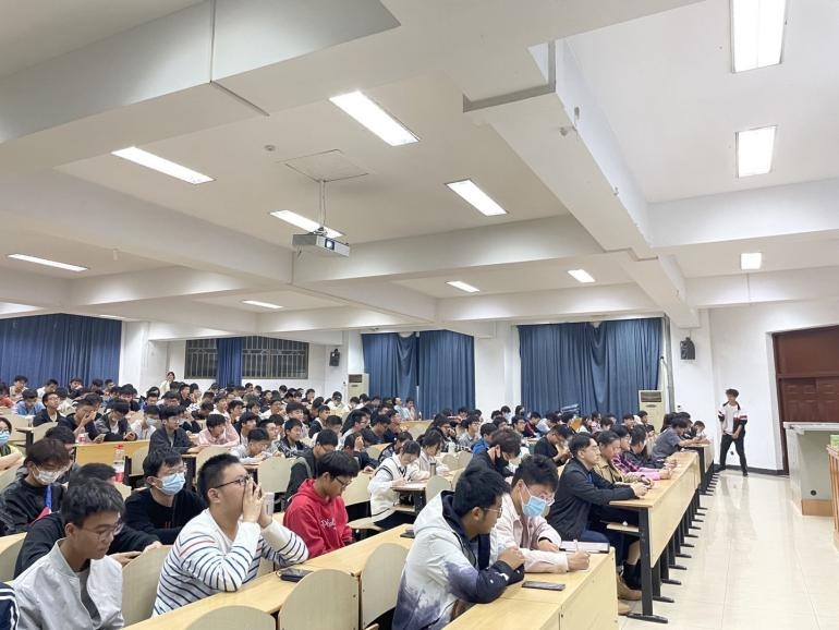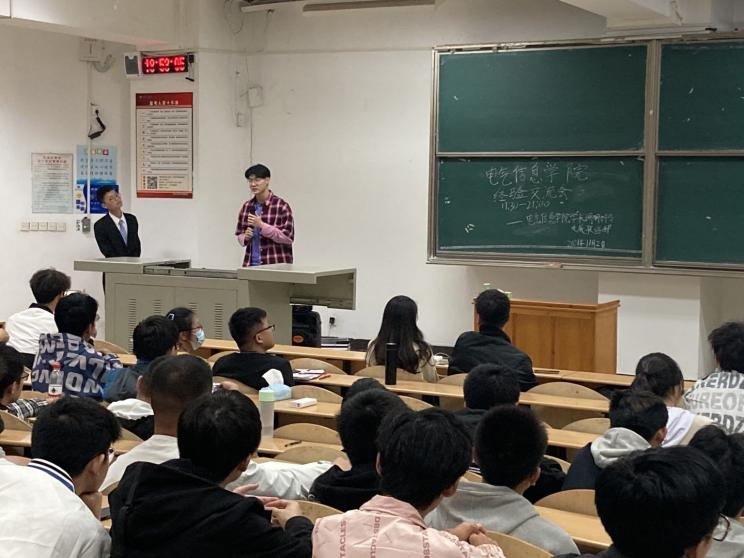 交流环节中,保研到西安电子科技大学的18级学姐赵晓圆向同学们分享自身的学习经验,提出要善于思考、劳逸结合、塑造良好学习氛围、有耐心肯钻研四点学习建议,同时根据自己的参赛经历讲解了蓝桥杯、FPGA创新设计大赛、弘电杯等相关竞赛,并分享了参赛经验与建议。