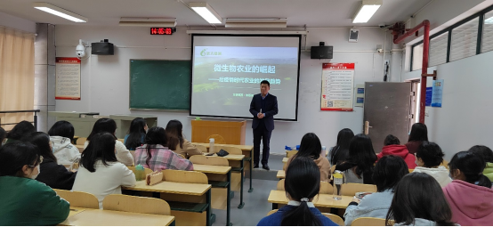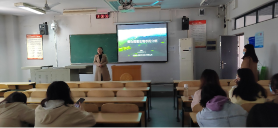 武汉武大绿洲生物技术有限公司董事长林春鸿、绿色防控产业发展研究院副院长陈娇以及科普教育部陶佩文三位专家,结合现代生物技术和企业的科研生产管理现状,进行了“微生物农业的崛起-后疫情时代农业的发展趋势”“昆虫病毒生物农药介绍”“绿色防控体系建设”等精彩报告,并带来了企业产品“昆虫病毒杀蟑螂饵剂”“植物驱蚊喷剂蚊子拜拜”等,作为礼物送给同学们。每场报告都有精彩互动,同学们对感兴趣的产业发展现状、就业状况、核心技术、应用前景等,在课堂现场提问,专家都进行了详细解答,讲座现场气氛非常活跃。