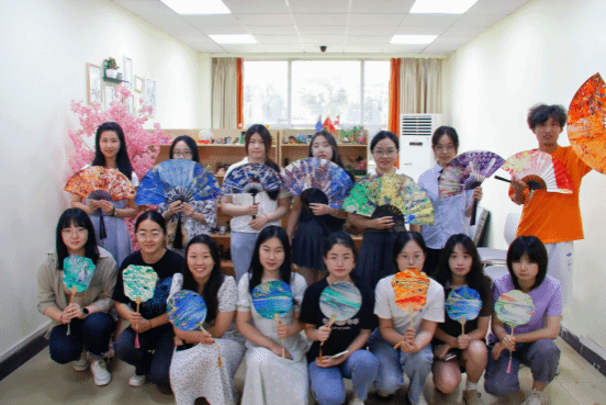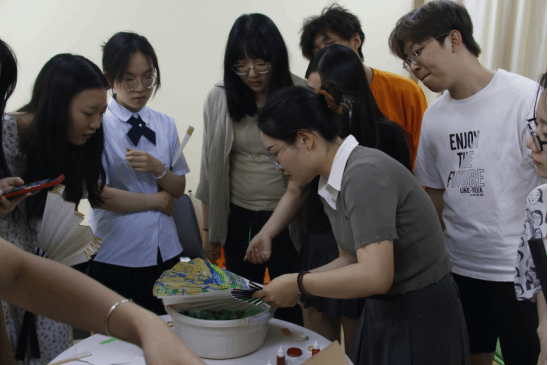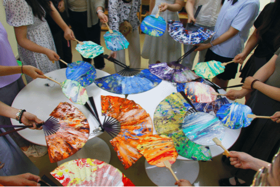 毕业生与老师们一起充分发挥创造力,各自选择颜料滴入水中,再将扇子浸入水中实现上色,像开盲盒一般,每个人都制作出独一无二的具有艺术感的漆扇。制作完成后,同学们把承载着满满诚意与祝愿的扇子送给老师,即将告别校园的大四学子们以这种别样的方式表达感恩之情,为老师们献上最真挚的祝福。