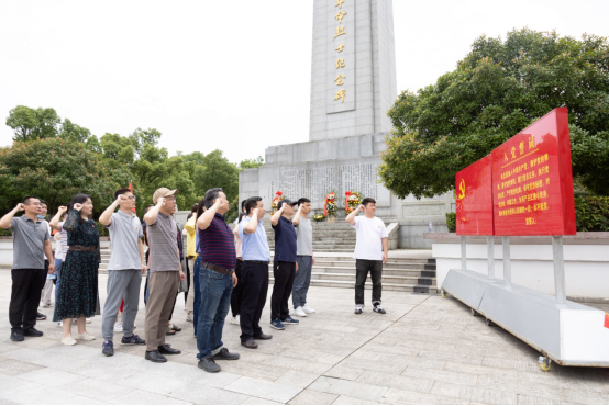 庄严的纪念碑广场上,一座通高27.6米的花岗石纪念碑矗立在陵园中心。碑身正面向北,镶嵌着“湘鄂西苏区革命烈士纪念碑”十二个大字;背面向南,刻着贺龙元帅生前题词:“革命烈士们的业绩鼓舞着我们永远前进”。碑的东西两侧上部,刻有中国共产党党徽、五星、稻穗和红旗组成的装饰图案。碑座正方上铭刻着国务院撰写的碑文。怀着对革命先辈的无限怀念和崇高敬意,学院党委副书记王超带领全体党员同志瞻仰纪念碑,深切缅怀革命先烈的丰功伟绩,并带领全体党员庄严宣誓,重温入党誓词。