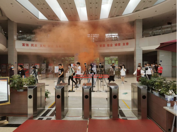 疏散演练结束后,保卫处在图书馆大门前广场对如何正确使用消防器材进行现场演示,并指导大家使用灭火器扑灭初发火情,在场师生热情高涨,踊跃参与。