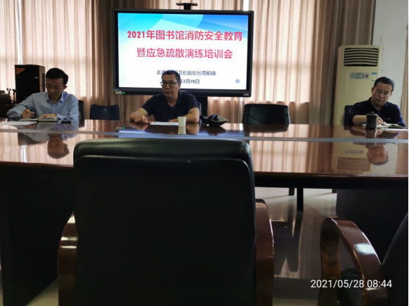 本网讯(通讯员 丁亚玲)为进一步增强图书馆全体职工和读者的消防安全意识,普及消防安全知识,推进消防安全宣传工作,5月28日上午,图书馆联合校保卫处在流芳校区图书馆三楼会议室召开了2021年图书馆消防安全教育暨应急疏散演练培训会。校保卫处周前锋副处长及消防管理科工作人员、图书馆领导和流芳馆职工参加会议。会议由图书馆党总支书记刘少洲主持。