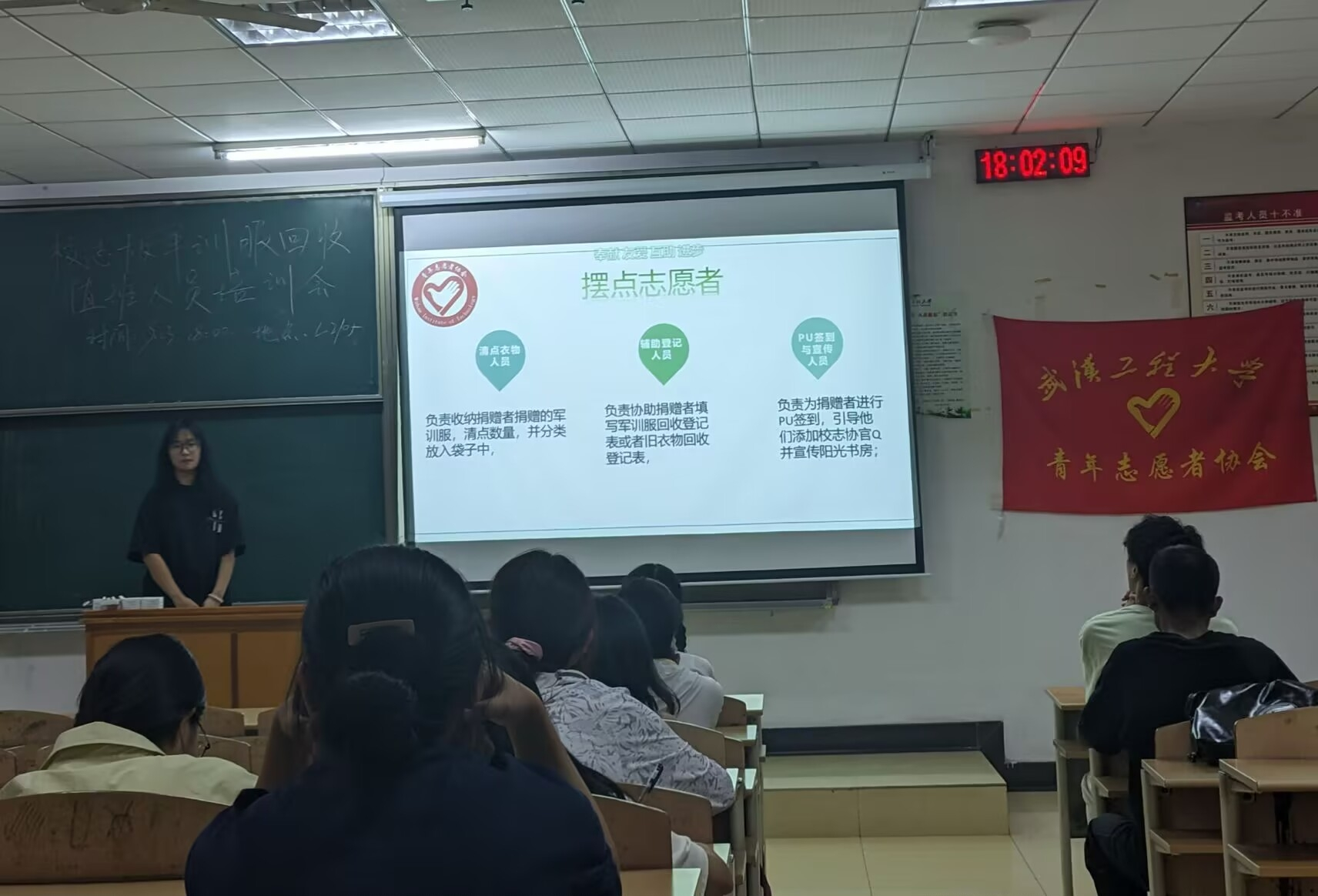 活动前期,校青年志愿者协会召开专题培训会,针对活动流程、工作分工、注意事项等工作进行详细讲解,并在校内多个场地进行军训服绿色活动摆点,顺利完成了活动宣传、军训服回收等相关工作。湖北省慈善总会将对军训服进行集中消杀、整理和打包,并将军训服捐赠给有需要的乡村学校。