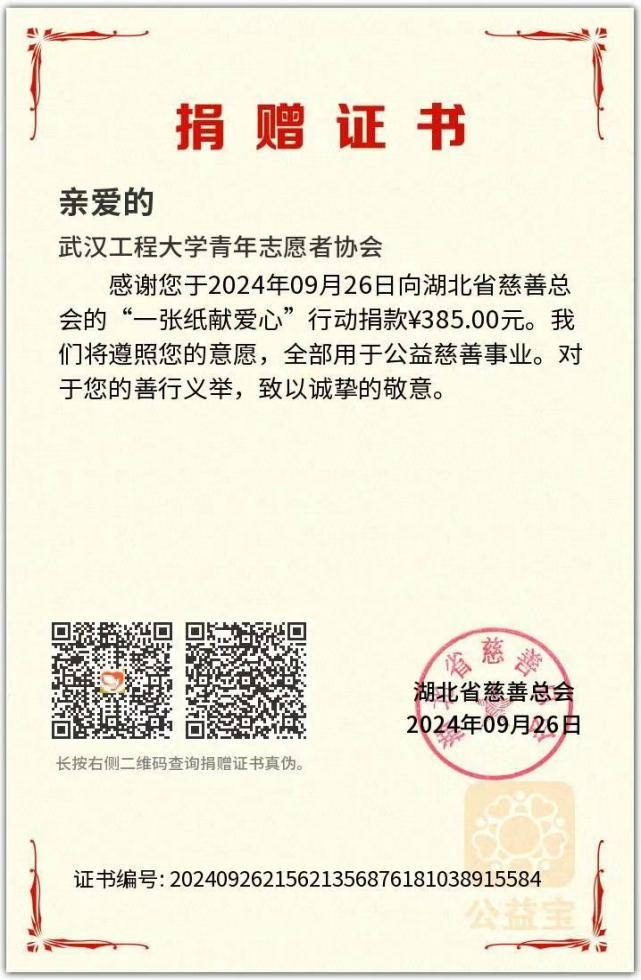 本网讯(通讯员 杨荣佳)金秋九月,邂逅迷彩。9月24日至9月25日,学校联合湖北省慈善总会共同举办“迷彩焕新意,爱心传校园”军训服回收活动。校青年志愿者协会获湖北省慈善总会捐赠证书。
