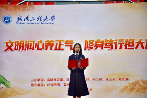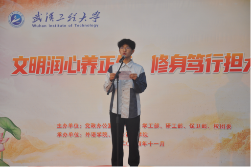 艺术设计学院2024级学生邢鼎坤在发言中号召同学们要以文明的言行举止,滋养自己的心灵,秉承“格物明理,致知笃行”的精神,在武工大的美丽校园中勤奋学习、勇于探索,在理论上有所建树,在实践中有所作为,用实际行动去践行文明和服务社会,实现个人价值和社会价值的相统一。