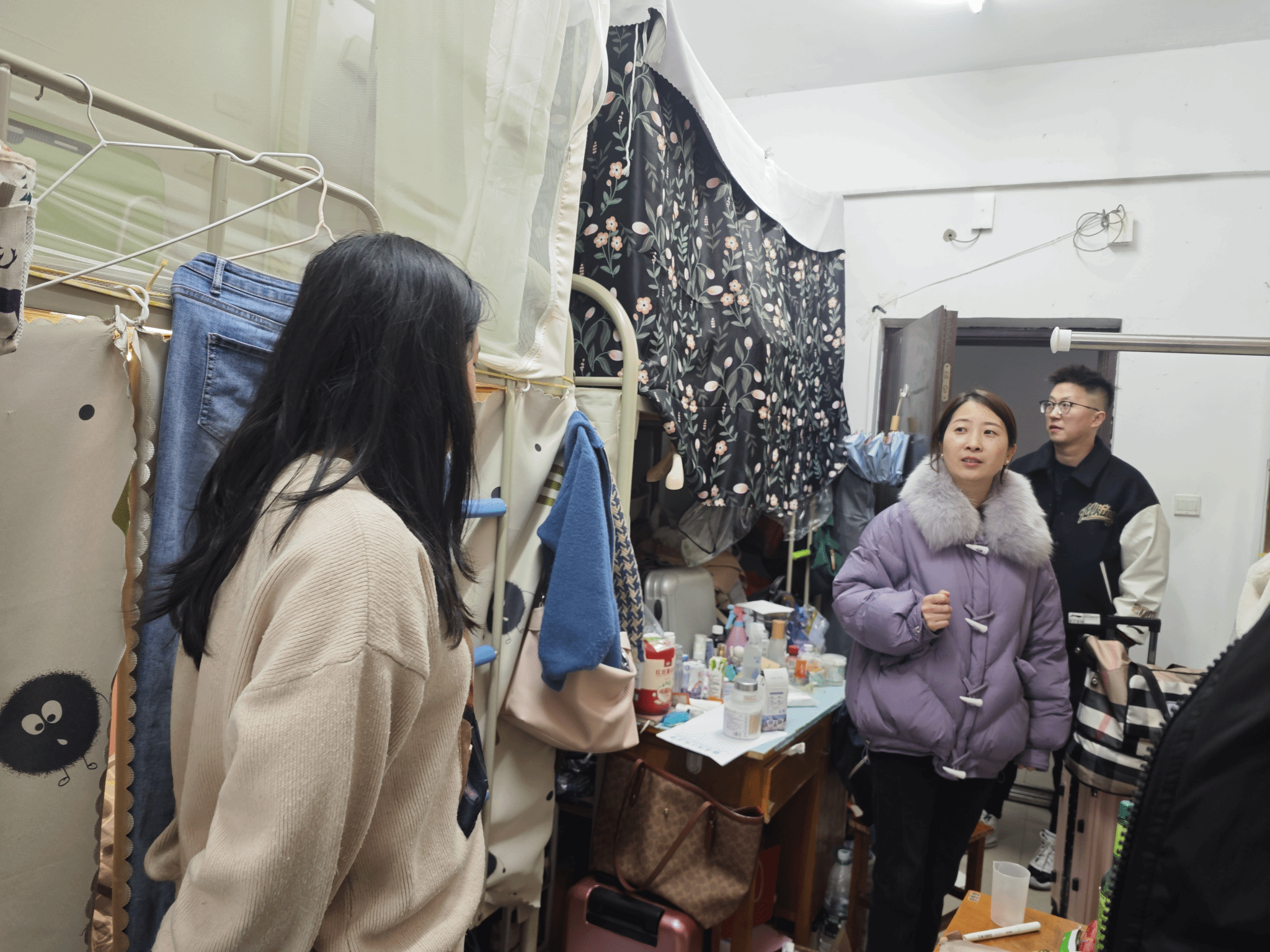 2月23日下午,学院党委副书记罗琼带领辅导员深入学生宿舍,走访慰问返校学生,详细了解学生假期生活、学习情况和思想动态,耐心解答学生关心的问题,鼓励学生尽快调整状态,以饱满的热情投入到新学期的学习生活中。同时重点排查了用电安全、消防安全、卫生安全等方面存在的隐患,并要求及时整改,为学生营造安全舒适的住宿环境。