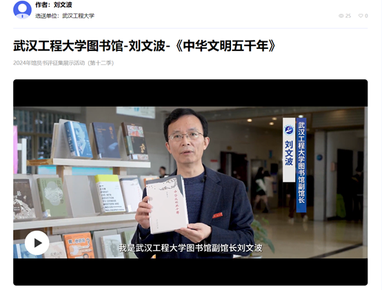该获奖视频通过丰富的镜头语言,在刘文波深入浅出的讲解下,将第十八届“文津图书奖”获奖著作、冯天瑜教授所著《中华文明五千年》的学术深度与艺术美感完美融合。视频采用真人摄影、相关素材剪辑等多元表现手法,在2分钟时长里浓缩呈现了中华文明从远古萌芽到近代转型的壮阔历程,充分展现了我校在数字阅读推广领域的创新探索。刘馆长从不同朝代的文明转型关键结点解说中华五千年文明演进轨迹,解析“和而不同”文化基因,阐释传统文化创新。