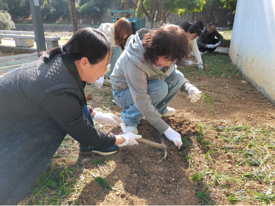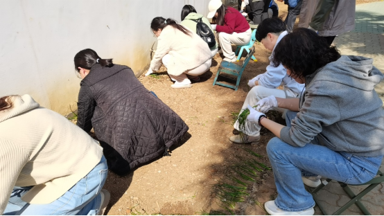 在武昌校区,党员们分工协作:一组细致清理许志伟广场的草坪、绿篱及砖缝杂草,捡拾枯枝落叶、碎石块与白色垃圾,并擦洗英雄许志伟雕像,以实际行动致敬英模精神;另一组在盆景园门口栽种葱兰。校园管理中心钟玉萍主任现场示范种植技巧,党员们认真学习、默契配合,将劳动实践与校园绿化紧密结合。流芳校区党员则集中清理教学楼中庭杂草,通过分工协作高效完成任务,为师生营造整洁环境。