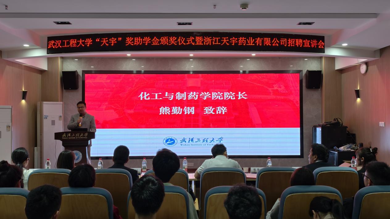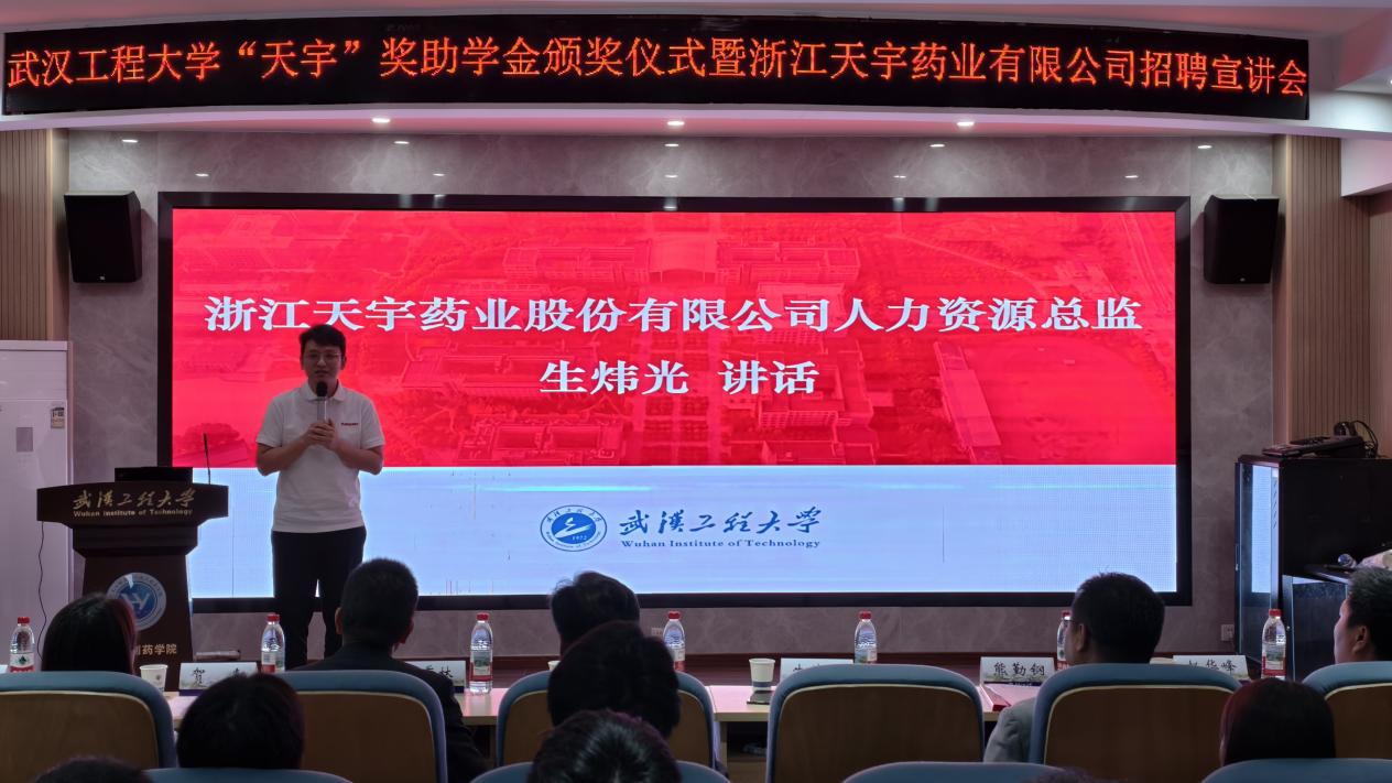 本网讯(通讯员 张锦 张宇轩)10月16日下午,学校“天宇”奖助学金颁奖仪式暨浙江天宇药业股份有限公司招聘宣讲会在流芳校区隆重举行。浙江天宇药业股份有限公司人力资源高级总监生炜光、质量控制总工汪秀林、生产经理赵华峰,化工与制药学院党委书记杨海波、院长熊勤钢及师生代表共同出席仪式,仪式由化工与制药学院党委副书记周丹主持。