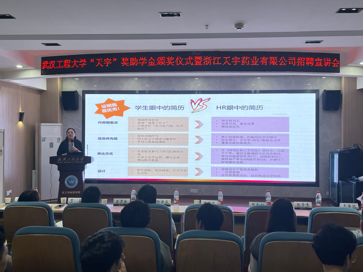 仪式结束后,浙江天宇药业股份有限公司开展招聘宣讲,汪秀林以“品质是生命线”为题进行宣讲,他强调天宇药业始终将质量意识贯穿于研发、生产、检验的每一个环节,将质量管理作为企业文化与责任担当。“前程无忧”资深职业经理人陈清清老师现场讲解简历撰写要点与面试技巧,并就行业趋势和求职策略进行了深入分享,帮助学生提升求职竞争力。