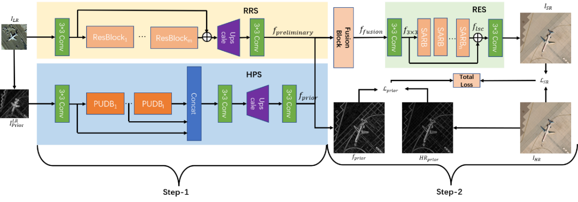 传统图像超分辨率方法假设先验约束服从高斯或拉普拉斯分布,并利用图像的统计特性重建高分辨率图像,然而团队在大量的实验研究中发现遥感图像的先验分布更趋向于超拉普拉斯分布。根据这一观测,研究团队提出了超拉普拉斯先验引导的图像超分辨率方法,利用图像的超拉普拉斯先验图指导恢复。一方面,通过先验重建分支恢复高分辨率先验图,为超分辨率过程提供额外的结构先验。另一方面,提出一种结构先验损失,对超分辨率图像施加二阶限制,从而帮助模型更多关注几何结构。该论文的算法框架如下图所示: