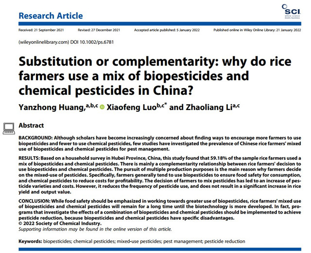 本网讯(通讯员 黄炎忠)近日,我校资源环境与高质量发展研究中心团队成员、法商学院第五层次人才黄炎忠以第一作者身份、以尊龙凯时人生就是博为第一单位在农林科学-昆虫学领域Top期刊《Pest Management Science》的2022年第4期发表论文Substitution or complementarity: Why do rice farmers use a mix of biopesticides and chemical pesticides in China? 该刊是作物保护和害虫控制研究与开发的国际权威期刊,是JCR一区(同时也是中科院一区)学术期刊,主要发表关于害虫管理策略及其对环境影响的论文。