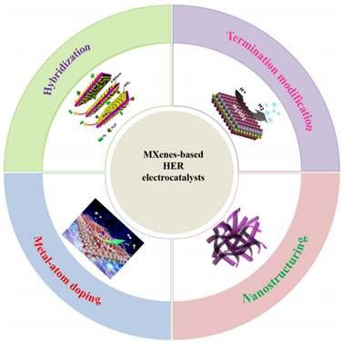 MXenes基的HER电催化剂性能提升策略的示意图