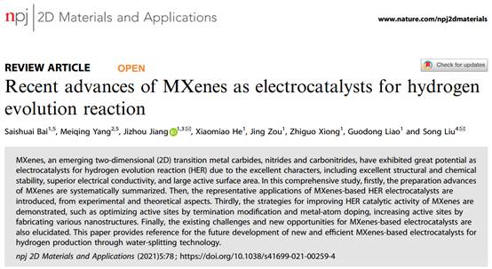 本网讯(通讯员 马科)近期,Nature旗下期刊npj 2D Materials and Applications(影响因子11.106,中科院JCR分区:工程技术一区,Top期刊)在线刊发了我校环境生态与生物工程学院青年教师江吉周博士课题组的题为"Recent advances of MXenes as electrocatalysts for hydrogenevolution reactions"的论文。本文发表后,受到了Nature出版社编辑的关注,推荐在Nature Portfolio公众号上进行重点介绍。