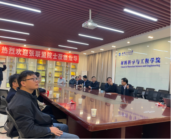 随后,张院士一行到材料学院进行了座谈,江学良代表学院进行了简要的汇报,徐慢教授代表学院师生对张院士一直以来的关心支持表示感谢。座谈现场,青年教师代表胡朴教授就自身遇到的困惑与张院士进行了交流,张院士鼓励青年教师要合理利用现有条件,多参加学术交流与合作,尤其是国际交流合作,瞄准国家重大需求精准发力,把文章写在服务社会、解决实际工程问题的一线。
